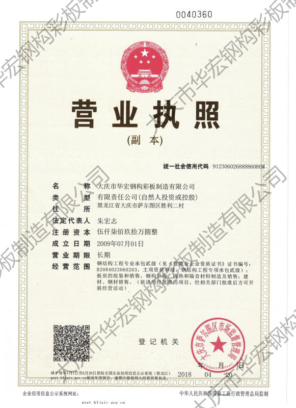 華宏鋼構(gòu)始建于2009年8月9日,總部位于大慶市薩爾圖區(qū)南一路13號,現(xiàn)有大慶市華宏鋼構(gòu)彩板制造有限公司、黑龍江省華宏力安綠建科技有限公司、大慶市華宏鋼構(gòu)彩板制造有限公司長春分公司、黑龍江省海森新材料科技有限公司、大慶市瑞和通螺栓廠五家工業(yè)企業(yè)形成了以彩板復(fù)合板、裝配式鋼結(jié)構(gòu)建筑、保溫材料、配件制造為主的五大生產(chǎn)基地,占地總面積 20余萬平方米,生產(chǎn)車間5萬平方米。中高層管理干部26 人,高級工程師9人,各類國家注冊執(zhí)業(yè)人員 32 人,車間技工 260人,專業(yè)安裝隊(duì)伍 10 余支,帶動就業(yè) 500